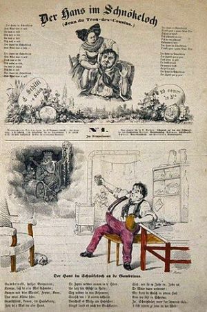 [[File : Hans-im-Schnœkeloch.jpg|thumb|Image du Hans im Schnokeloch avec les paroles de sa chanson]] | |||